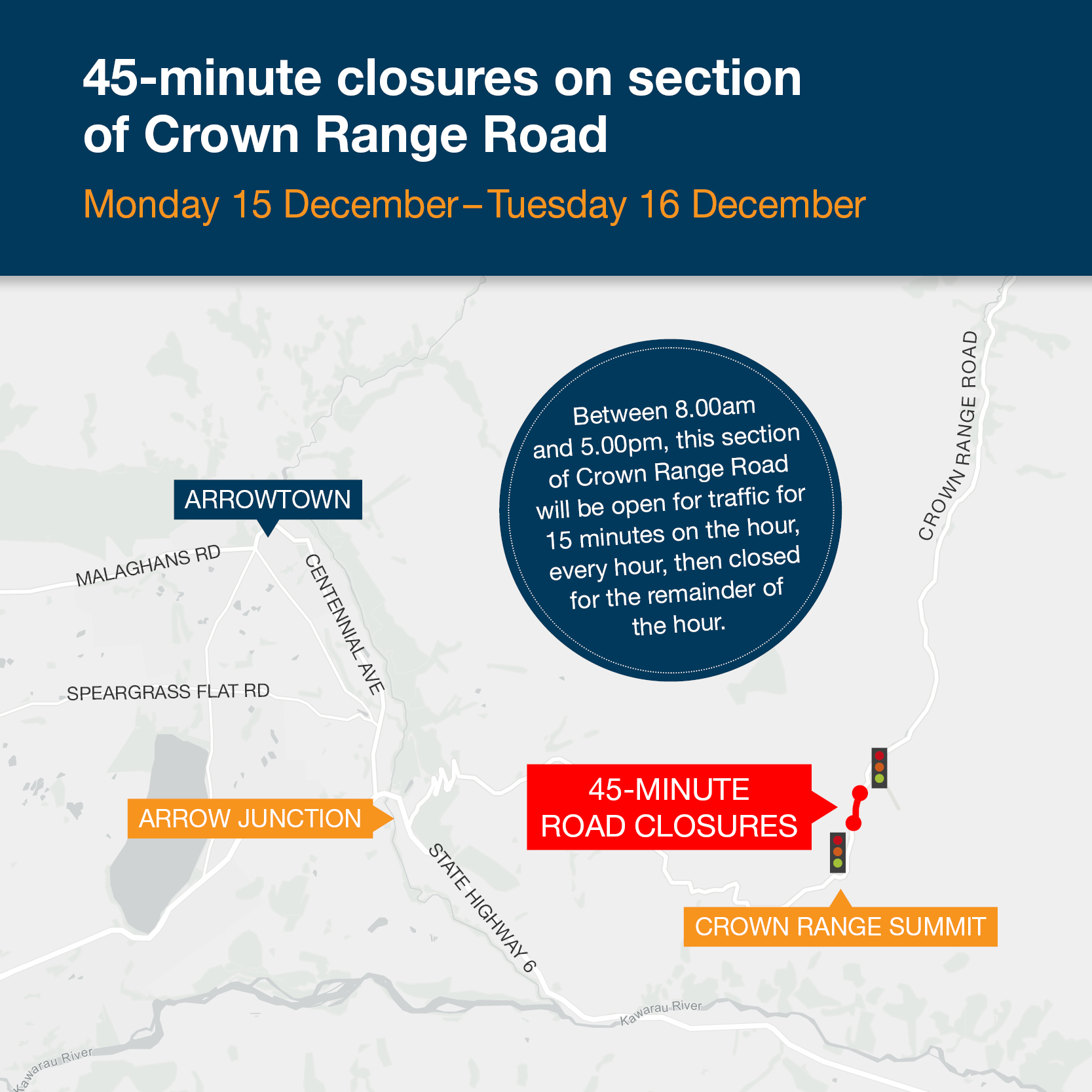 45 minute closures and stop/go on section of Crown Range Road to address rockfall protection fencing
