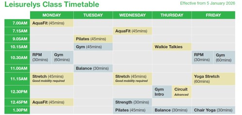 Important notice - The Leisurelys programme will break over Christmas from 22 December. The classes will resume (with the new timetable below) on 5 January.
