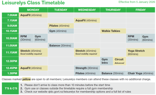 Important notice - The Leisurelys programme will break over Christmas from 22 December. The classes will resume (with the new timetable below) on 5 January.