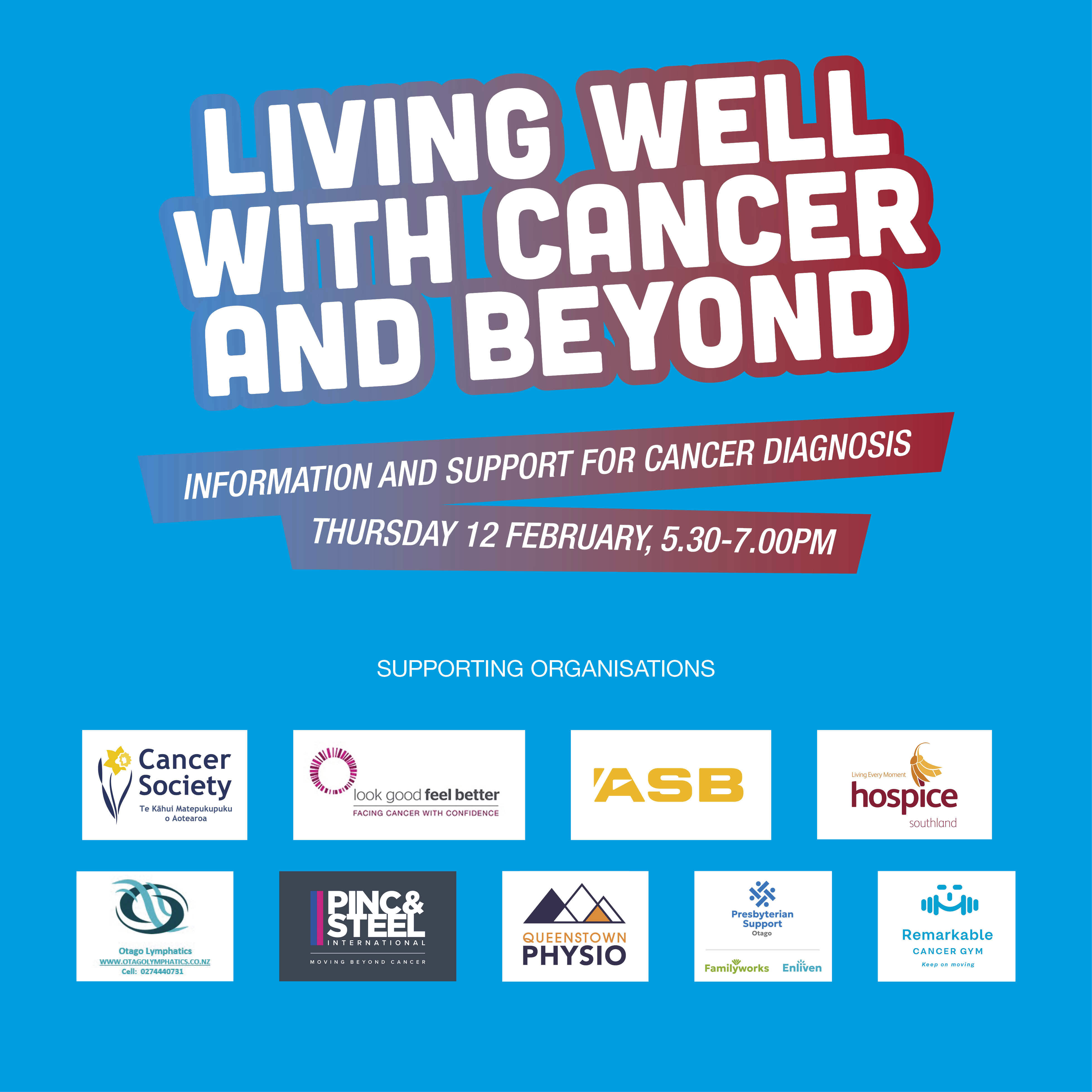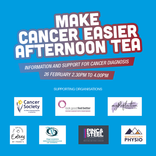 A free event for those affected by cancer to help understand the support services available in the Queenstown Lakes District. We will have guest speakers and service providers present to talk about how they can help.