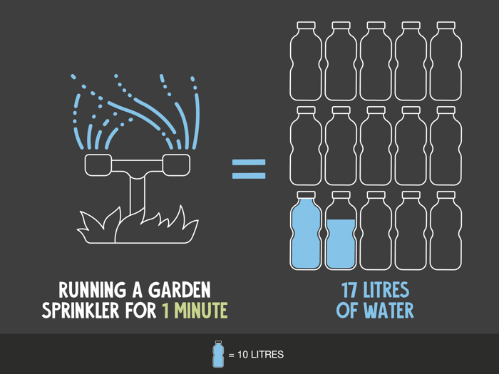 Running a garden sprinkler for one minute can use up to 17 litres of water. If you're running a sprinkler on the lawn for an hour, that's over 1,000 litres of water!