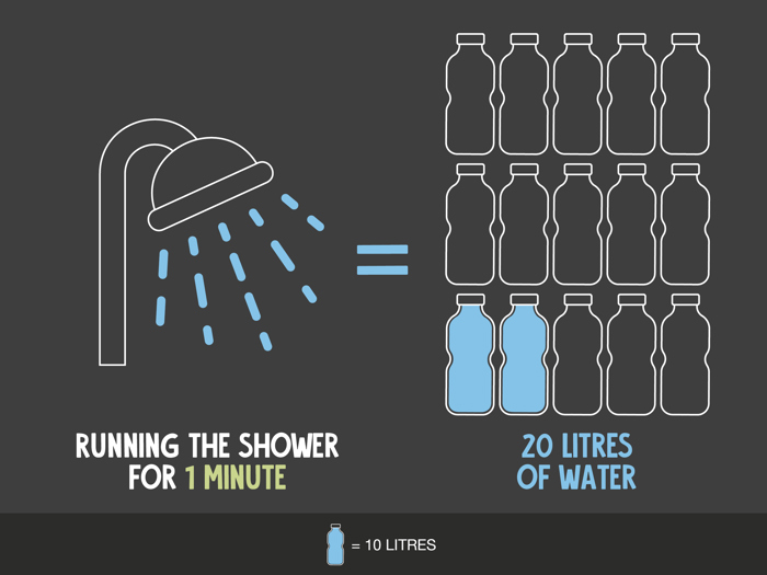 Running a shower for one minute can use up to 20 litres of water, meaning a 10 minute shower in the morning and night could use around 400 litres of water!