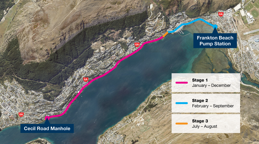 As mentioned above, the new wastewater pipeline along Frankton Track will be built in stages to minimise disruption as much as possible, but large sections of the lakeside track will need to be closed for several months during each stage of work. We’ve detailed some key information to be aware of for each stage and more general disruption to expect below.