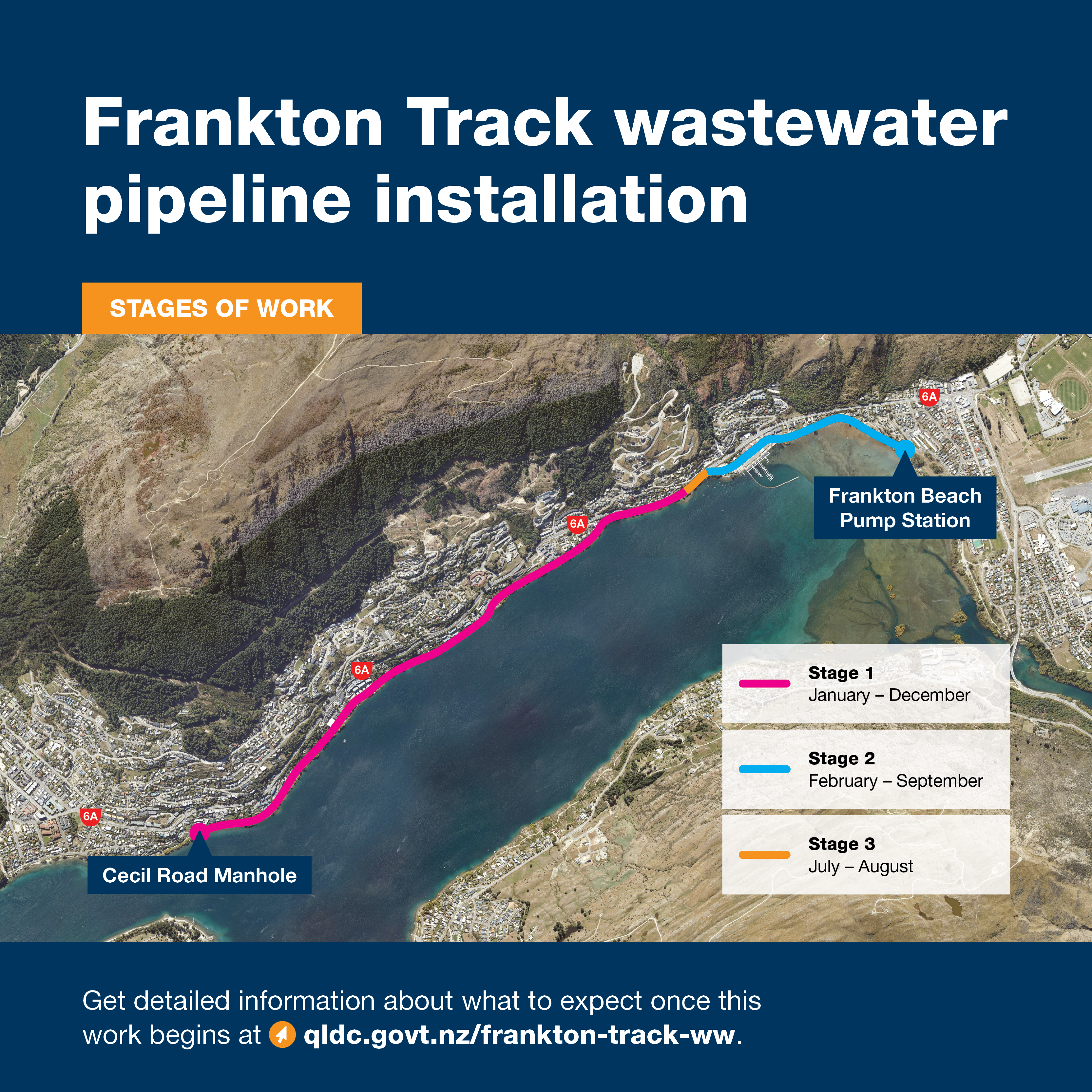 Installation of the new wastewater pipeline in Stage 1 will require a pedestrian and cyclist detour using the footpath on Frankton Road, leaving Frankton Track near Middleton Road before rejoining near Cecil Road. This detour will need to remain in place for the majority of the year.