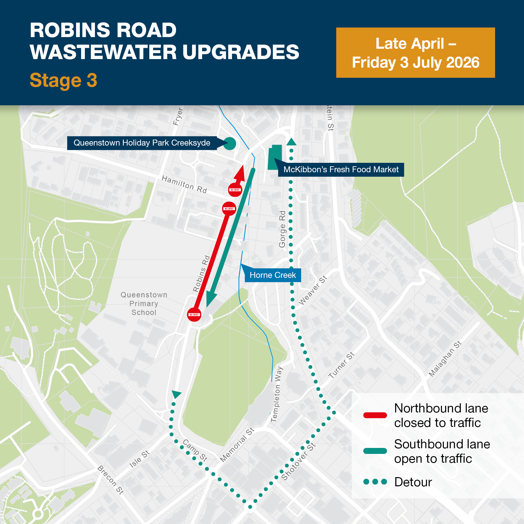 The northbound lane on Robins Road will be closed from Queenstown Park Boutique Hotel through to Queenstown Holiday Park Creeksyde during this stage of work. The southbound lane will be open to traffic.